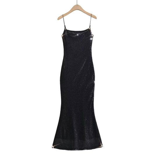 Spaghetti Evening Strap Back Gown Open Sequin Mermaid Neck Scoop