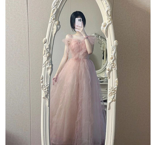Strap Gown Spaghetti Panel Evening Plain Mesh A-Line Bow
