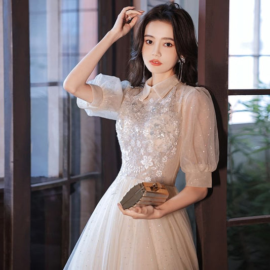 Square-Neck (Various Evening Designs) A-Line Sequined Puff-Sleeve Floral Gown