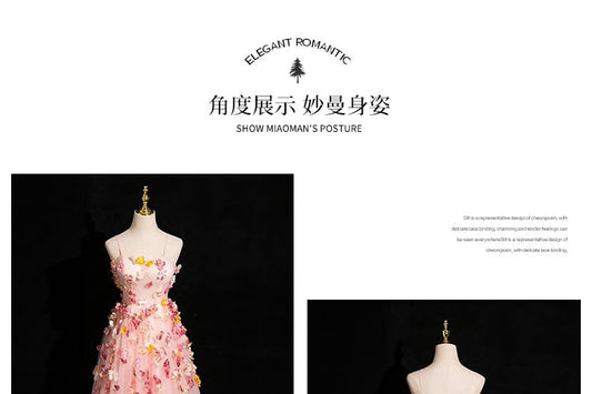 Strap Floral Gown Mesh Applique Spaghetti Evening A-Line