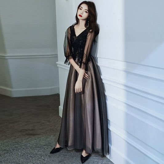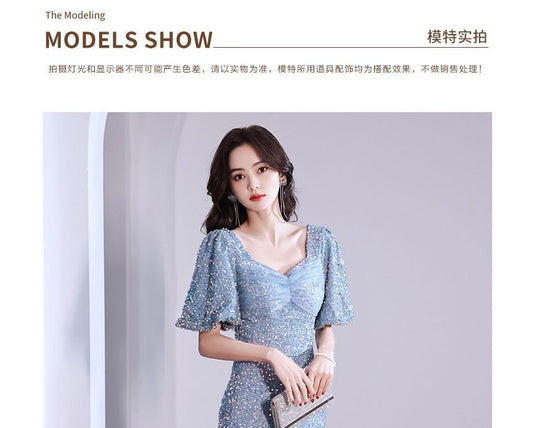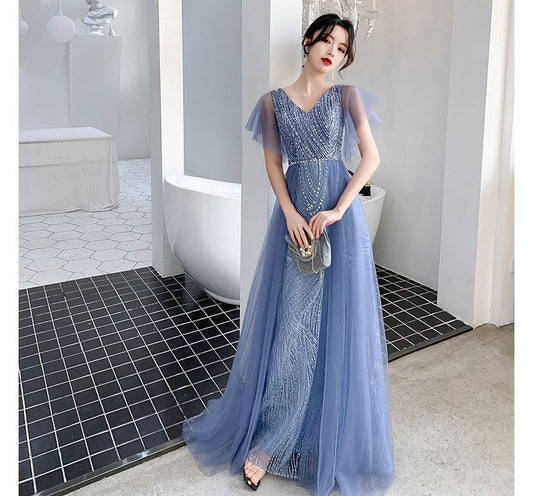 V-Neck Sequin Dress Puff-Sleeve Mesh A-Line Evening / Gown