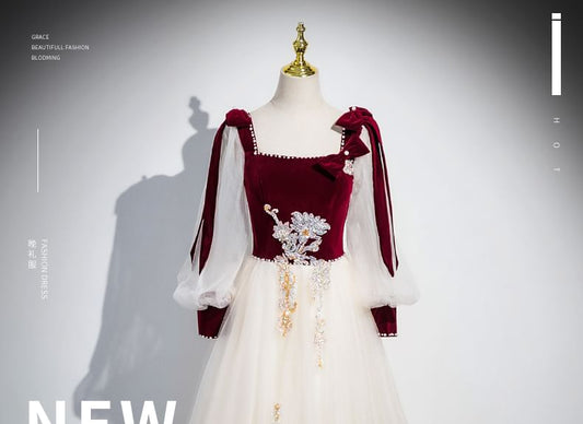 Velvet Long-Sleeve Gown Panel Sequin Tulle Evening A-Line Floral