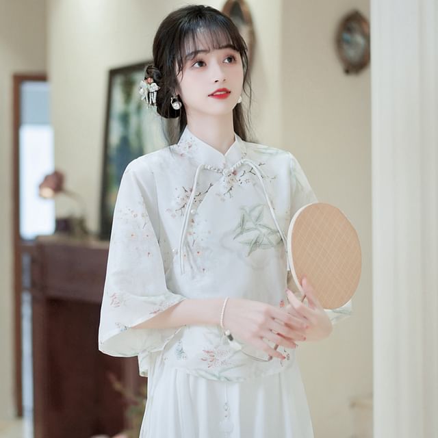 Elbow-Sleeve Mandarin Collar Floral Print Top / High Rise Plain Maxi A-Line Skirt