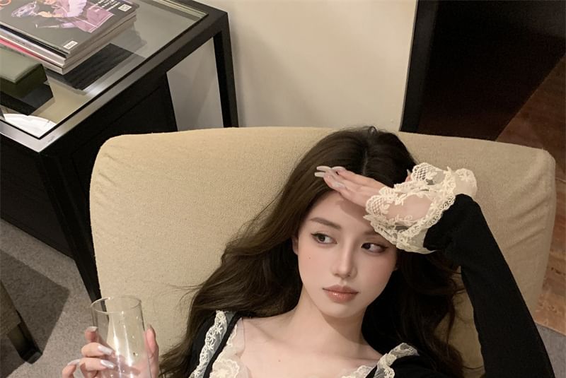 Long Sleeve Scoop Neck Plain Lace Trim Crop Top