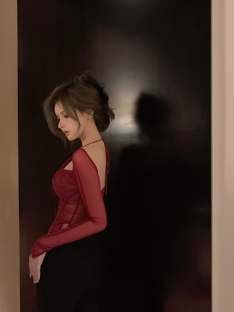 Long Sleeve Square Neck Plain See-Through Lace-Up Mesh Crop Top