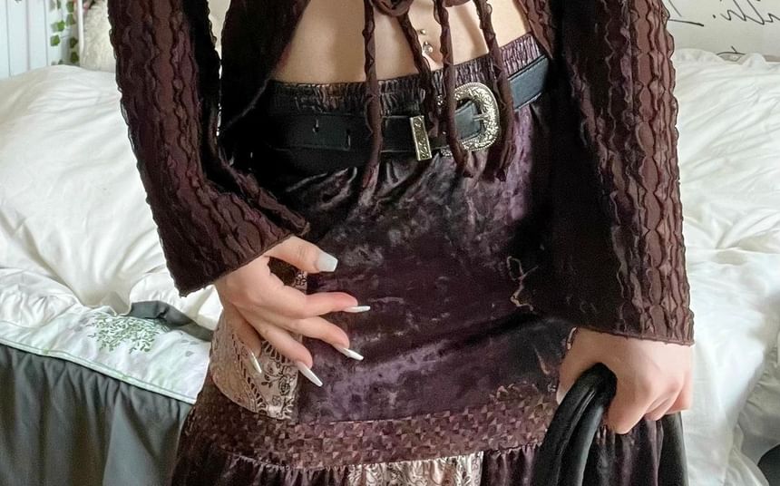 Long-Sleeve V-Neck Butterfly Print Ribbon Front Crop Top