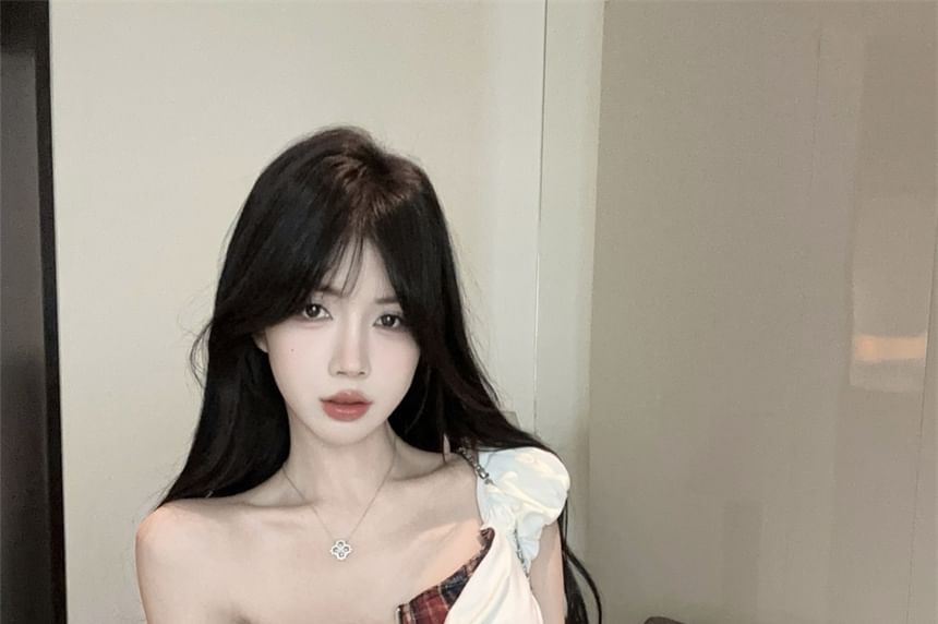 Mock Two-Piece Cap-Sleeve Plaid Trim Crop Top