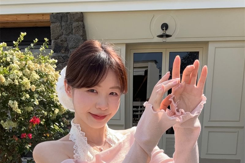 Mock Two-Piece Long-Sleeve Halter Lace Panel Slim Fit Tee