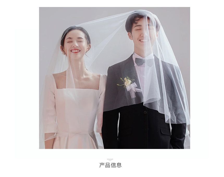 Elbow-Sleeve Square Neck Plain Pleated A-Line Wedding Gown