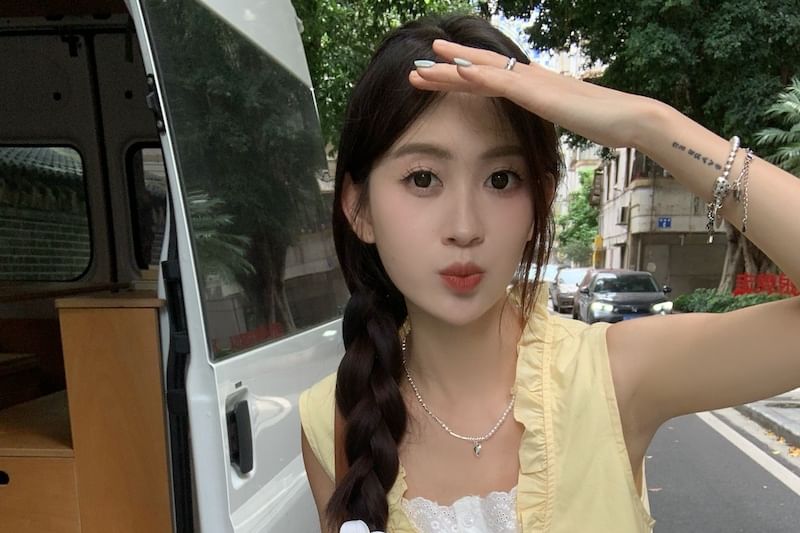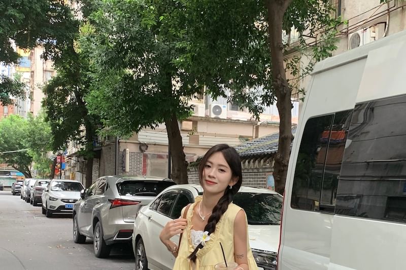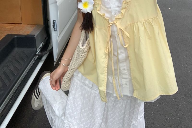 Mock Two-Piece Sleeveless Two Tone Frill Trim Tie Front Blouse