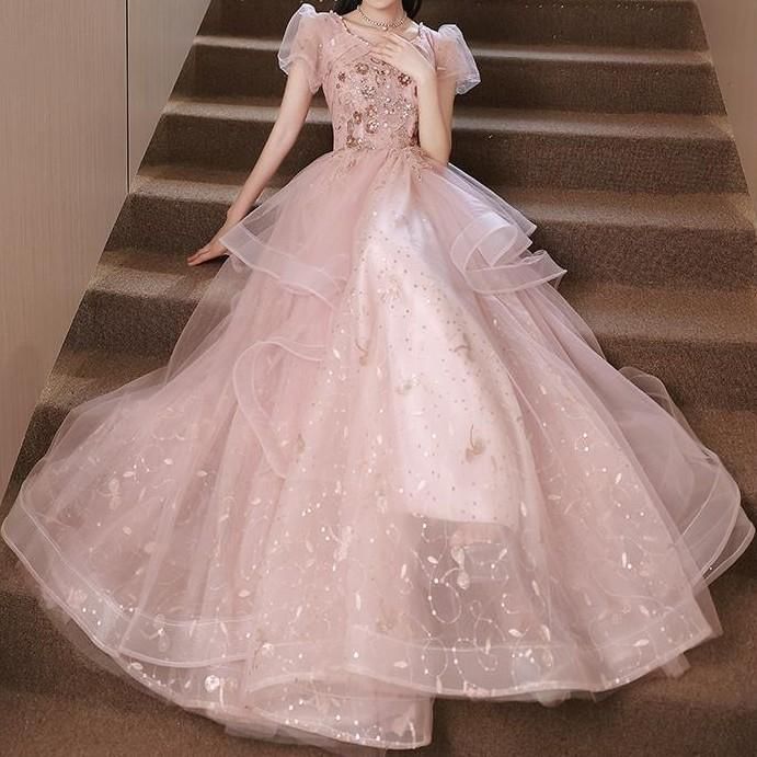 Puff-Sleeve V-Neck Sequin A-Line Evening Gown