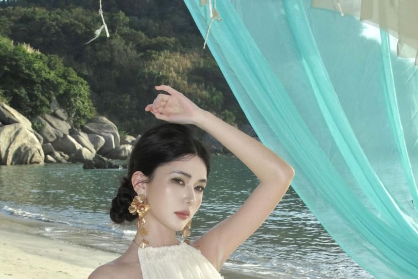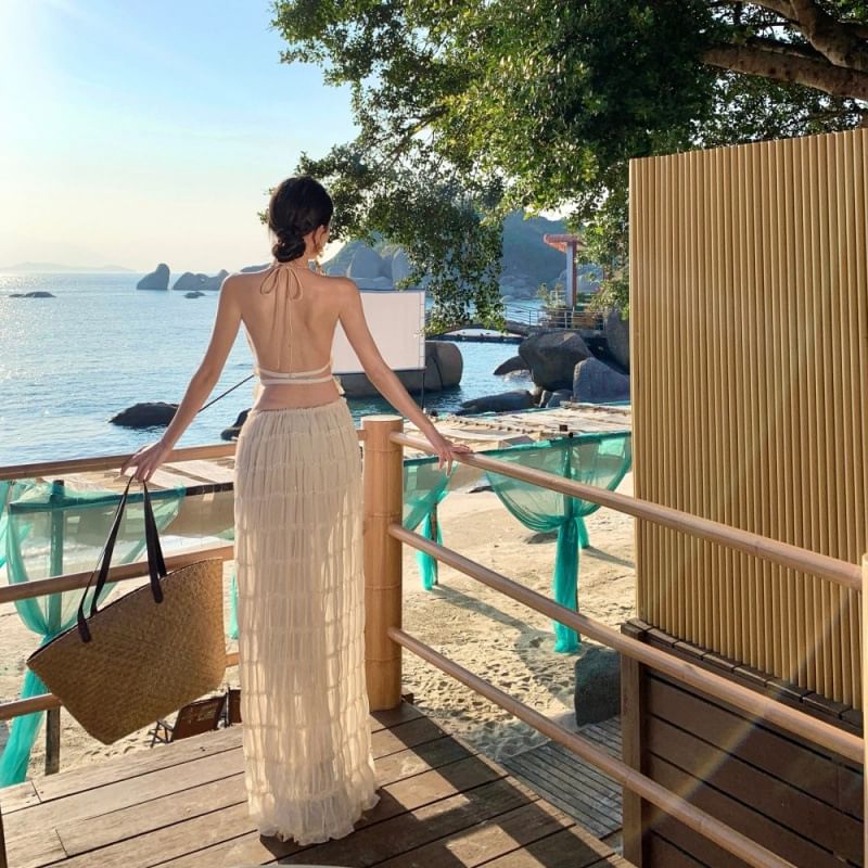 Set: Halter Neck Crop Cami Top + High Rise Plain Maxi A-Line Skirt