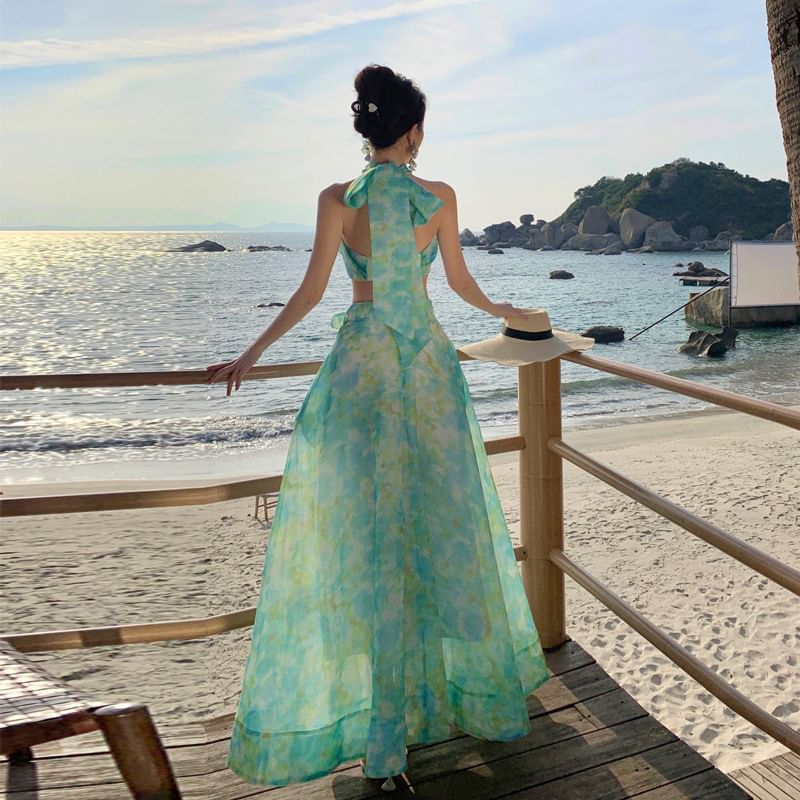 Set: Sleeveless Floral Crop Top + High Rise Floral Maxi A-Line Skirt