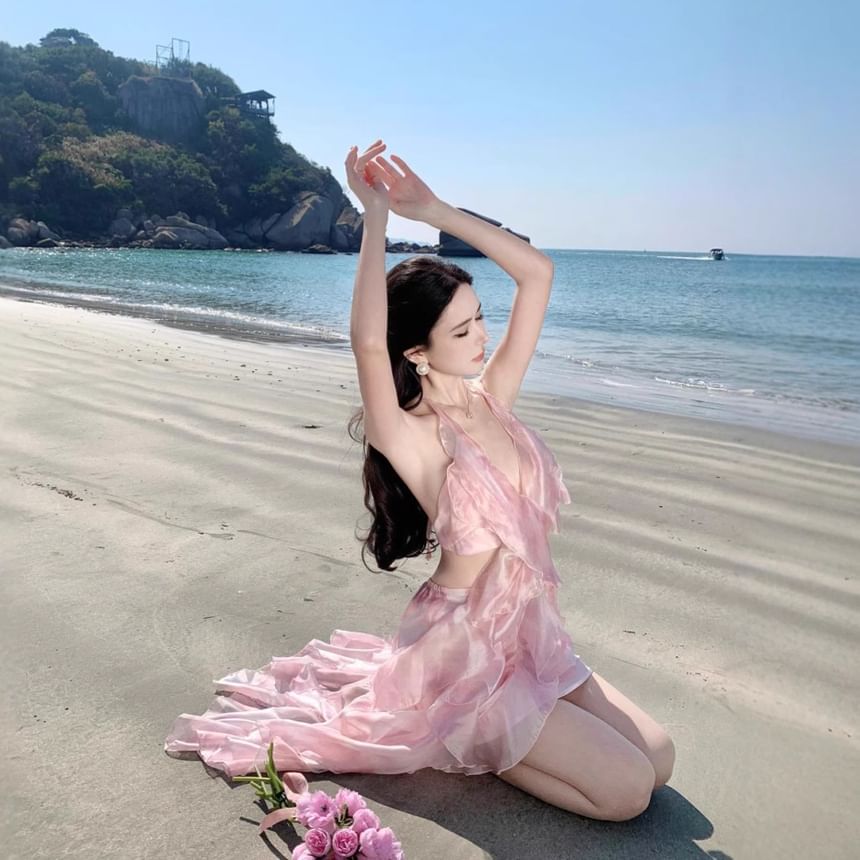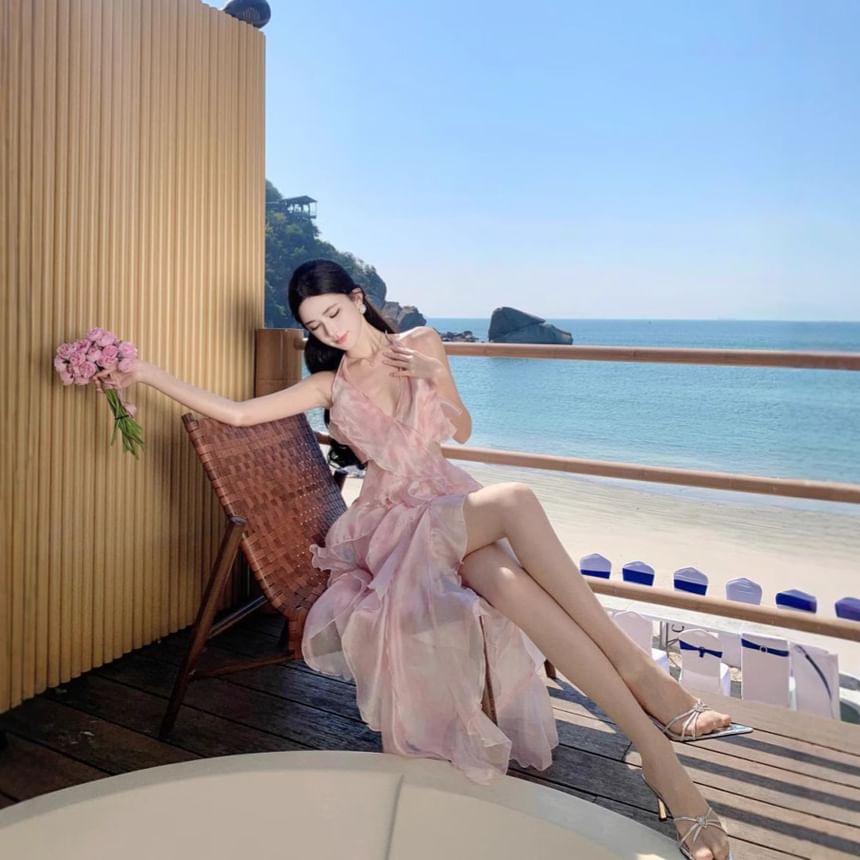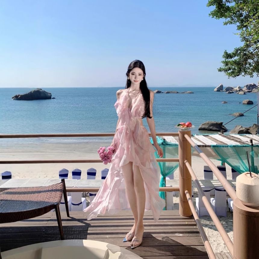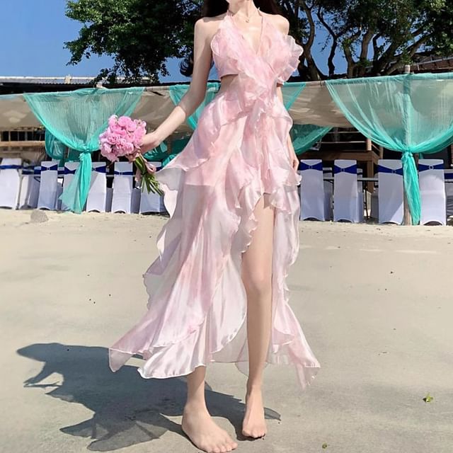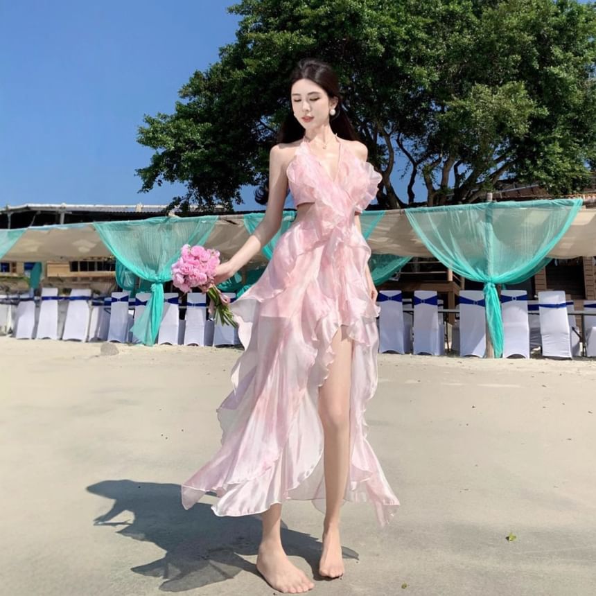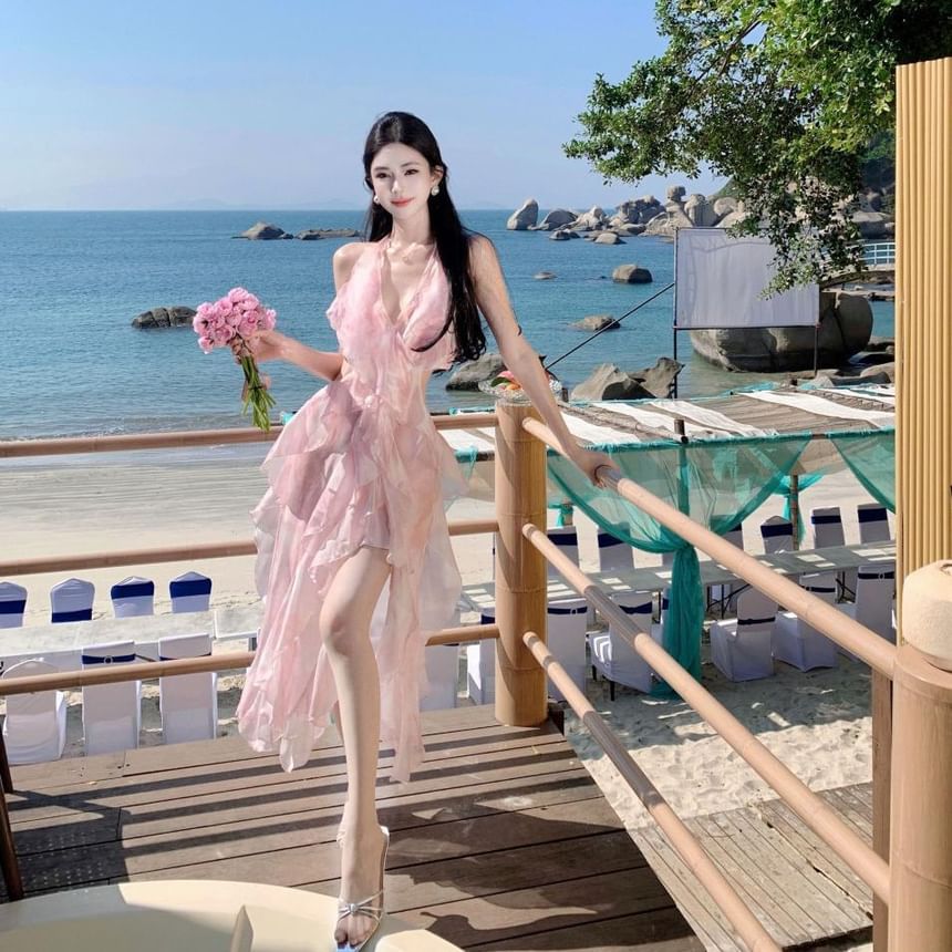Set: V-Neck Halter Floral Crop Top + High Waist Midi A-Line Skirt