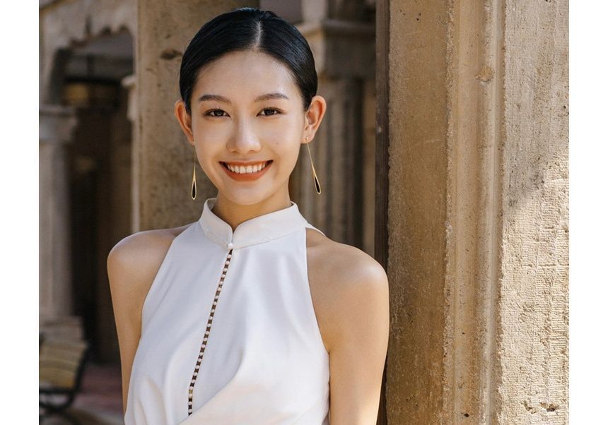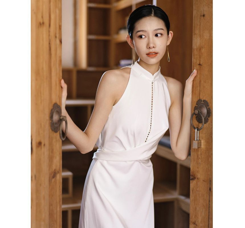 Sleeveless Mandarin Collar Plain Criss Cross Backless Sheath Wedding Gown