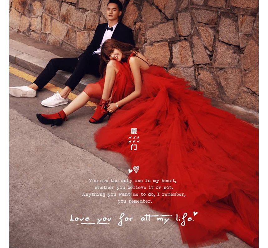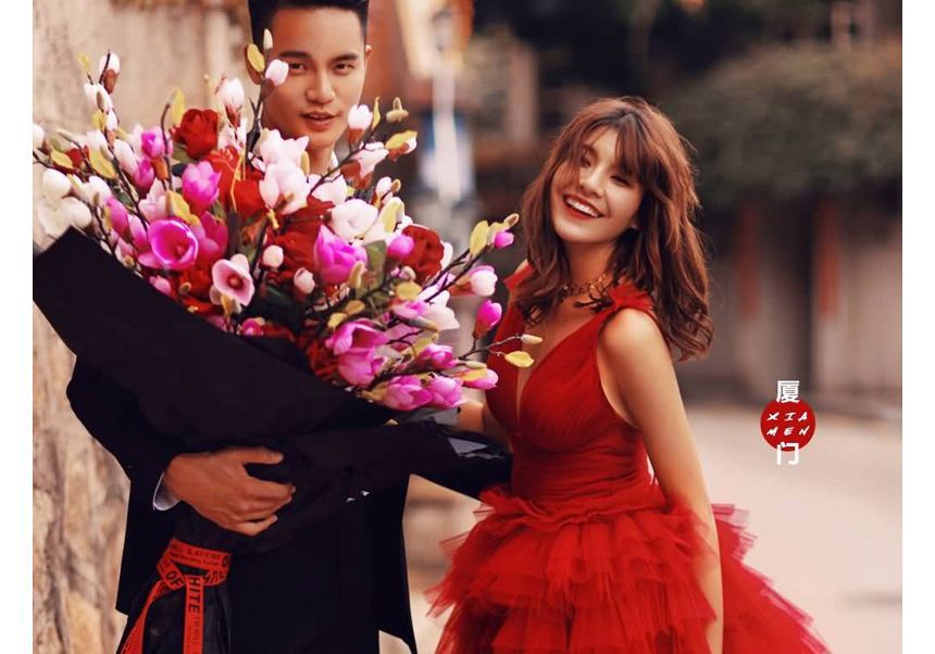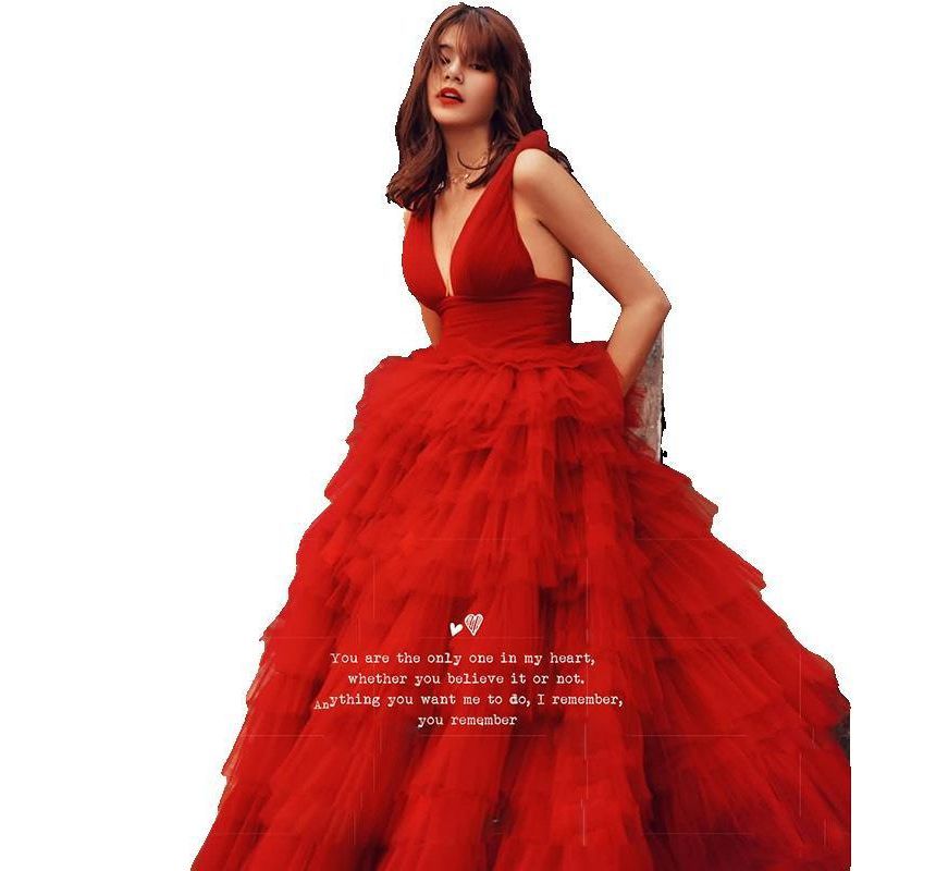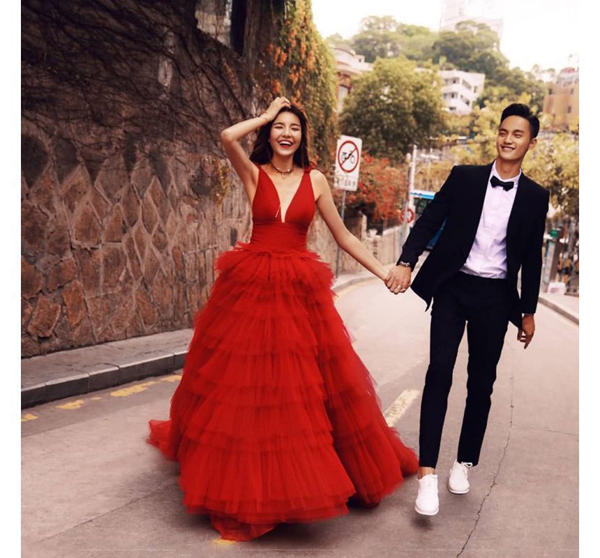 Sleeveless V-Neck Plain Tiered A-Line Evening Gown