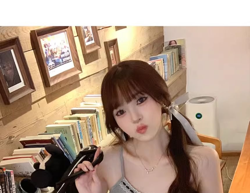 V-Neck Plain Bow Accent Lace Trim Crop Cami Top