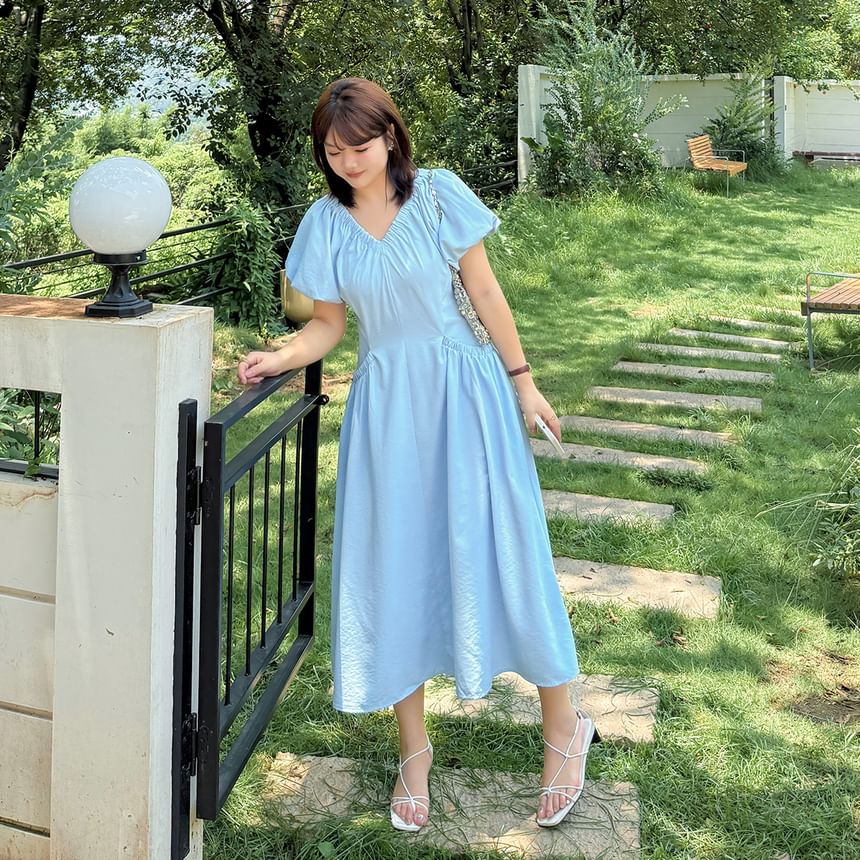 Plus Size Puff Short Sleeve V-Neck Plain Ruched Midi A-Line Dress