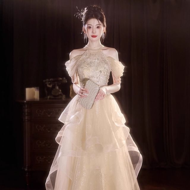 Sequin Evening Off-Shoulder Bead Gown A-Line