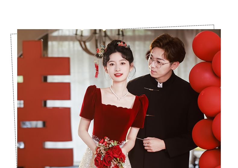 Sequin Neck Short-Sleeve Square A-Line Evening Gown Panel