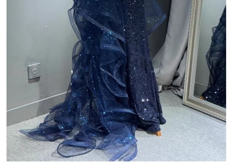 Sequin Panel Gown Evening Mermaid Trained Halter Mesh Neck