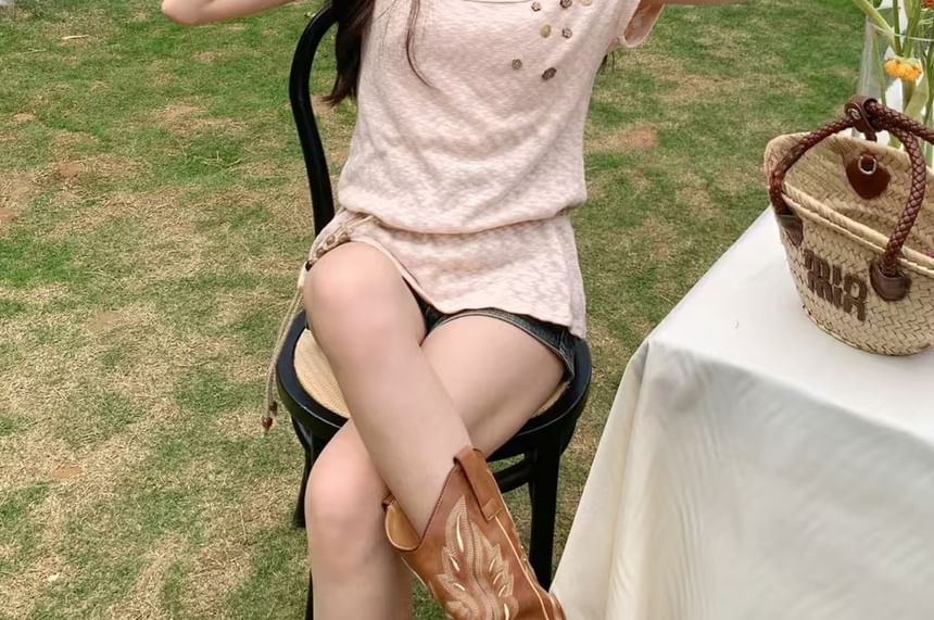 Set: Short Sleeve Cold Shoulder Plain Button Top + Cord Belt