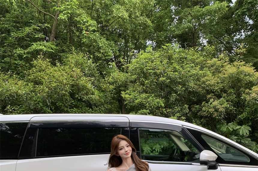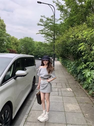 Set: Sleeveless Cold Shoulder Panel Lace Crop Top + High Waist Mini Pencil Skirt