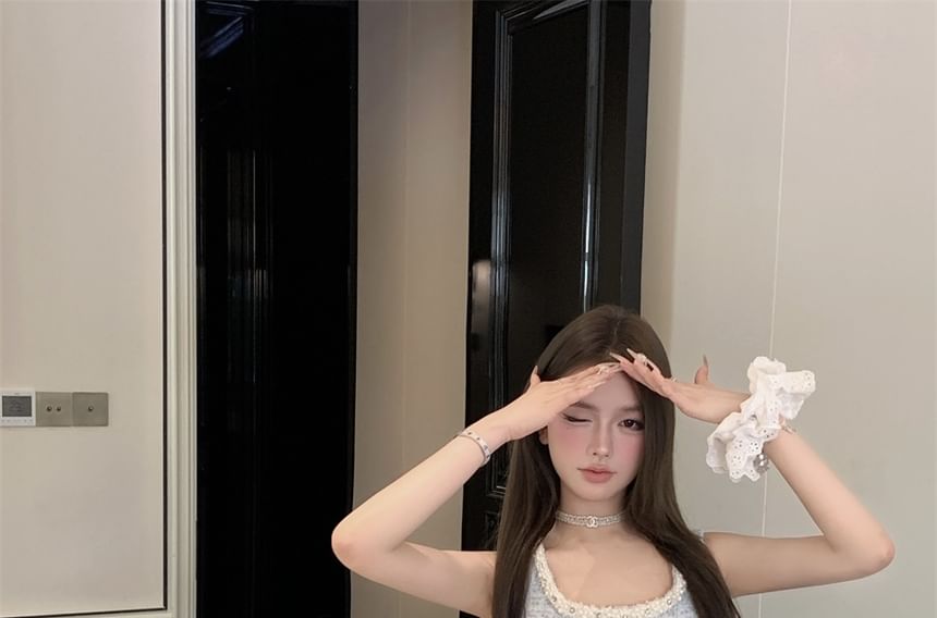 Set: Sleeveless Scoop Neck Beaded Faux Pearl Button Tweed Crop Top + High Waist Mini Pencil Skirt