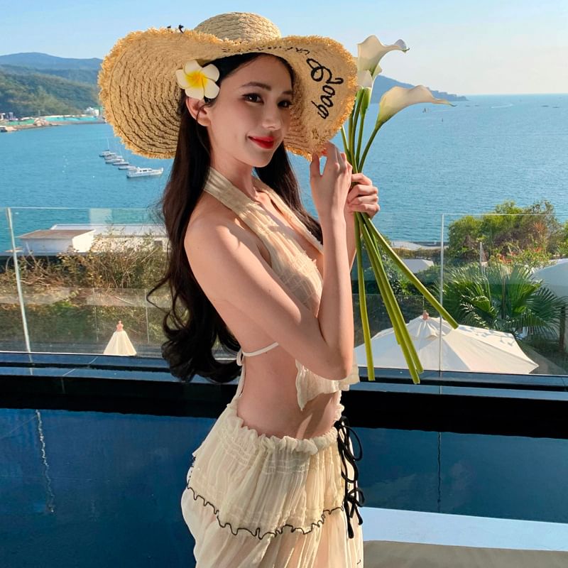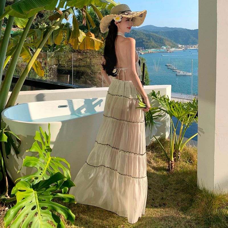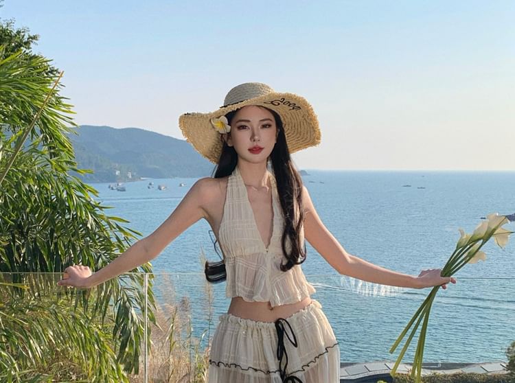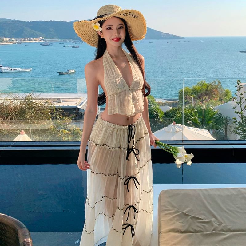 Set: Sleeveless V-Neck Plain Crop Top + Mid Rise Bow Detail Maxi A-Line Skirt