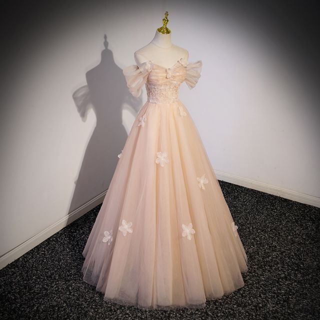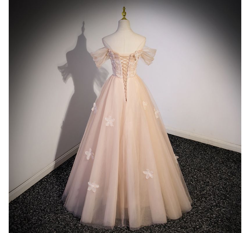 Short-Sleeve Off Shoulder Floral Patterned Panel Mesh A-Line Evening Gown