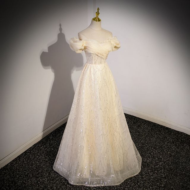 Short-Sleeve Off Shoulder Plain Sequin Ruched Mesh A-Line Evening Gown