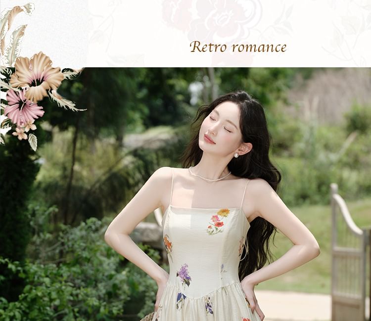 Spaghetti Strap Square Neck Floral Print Maxi A-Line Dress / Plain Crop Cardigan / Set