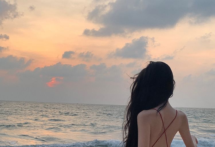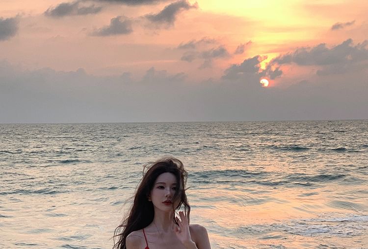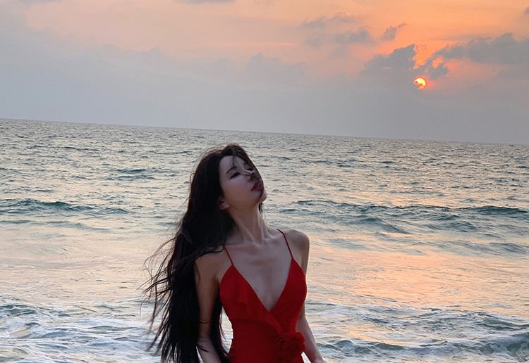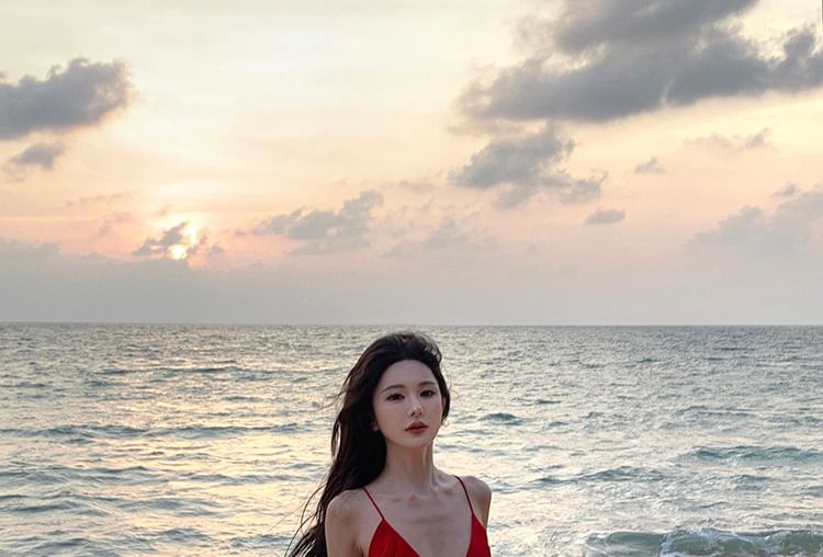 Spaghetti Strap V-Neck Plunge Plain Ruffle Trim Open Back Slit Maxi A-Line Dress