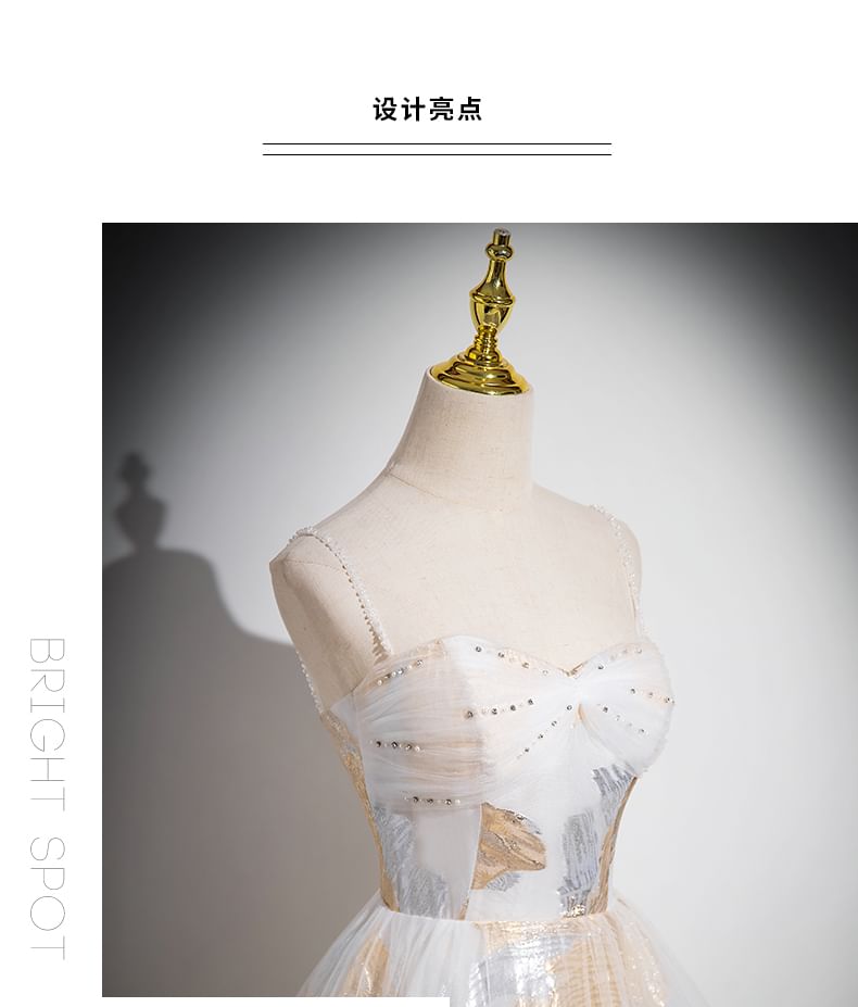 Spaghetti Strap Patterned Print Beaded Mesh A-Line Evening Gown