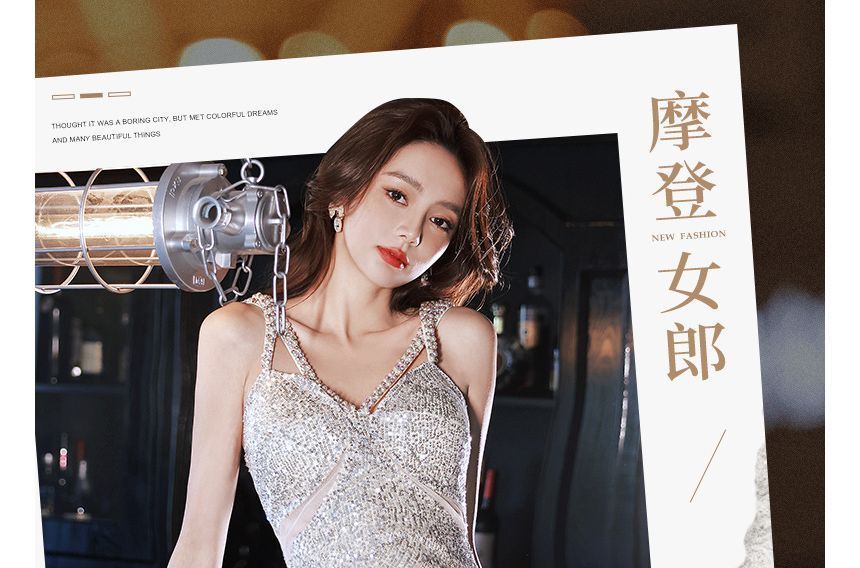 Strap V-Neck Gown Evening Mermaid Sequin Pearl Beaded Spaghetti Faux Plain