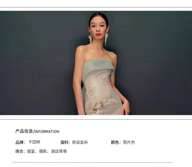 Strapless Floral Print Bow Back Slit Sheath Evening Gown