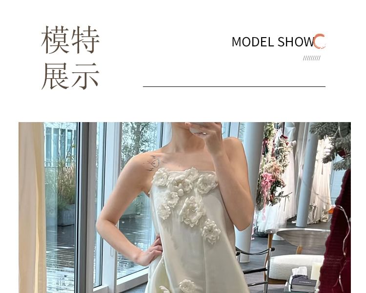 Strapless Plain Floral Accent Trained Bow Back Satin A-Line Wedding Gown