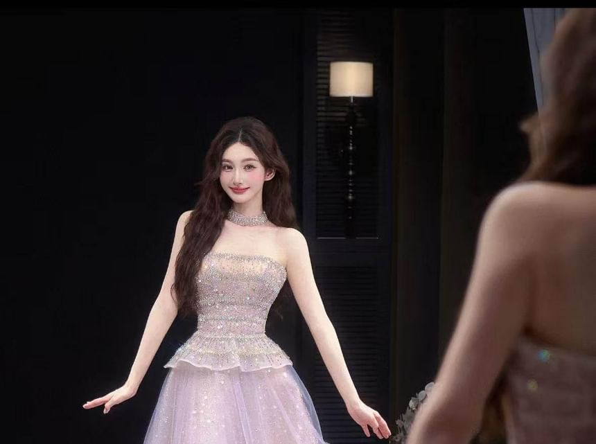 Strapless Sequin Flower Accent Ruffle Trim A-Line Evening Gown