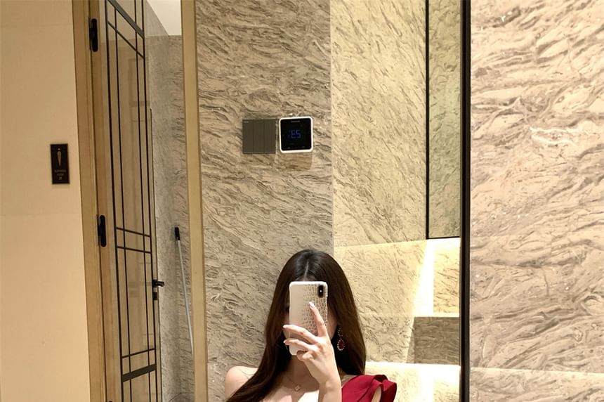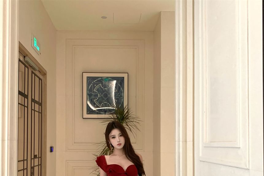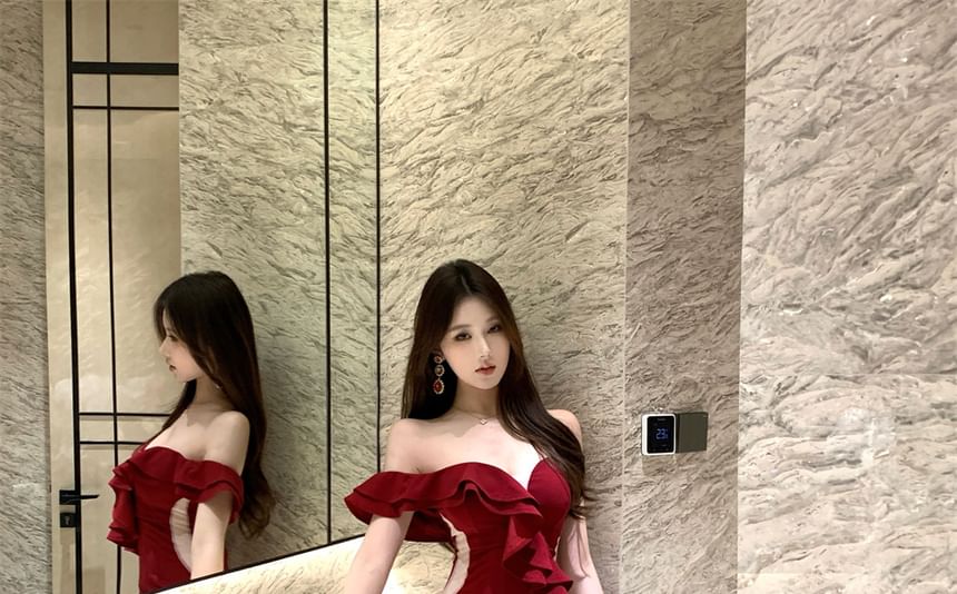 Off Shoulder Ruffle Trim Panel Mermaid Evening Gown
