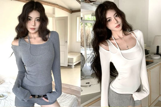 Long-Sleeve Scoop Neck Plain Mock Two-Piece Tee