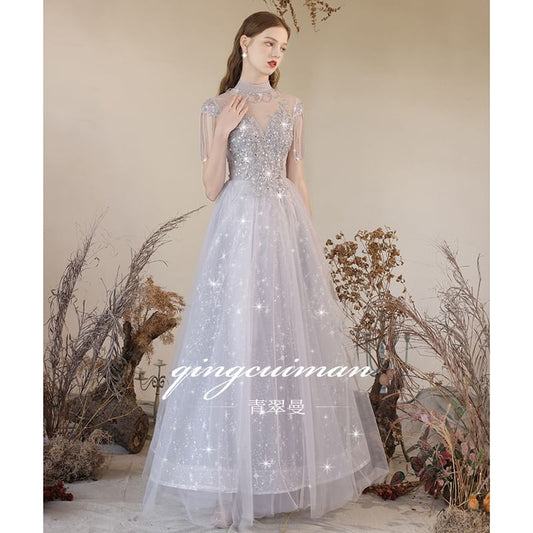 Cap-Sleeve Mock Neck Sequin Rhinestone Fringed Mesh A-Line Evening Gown