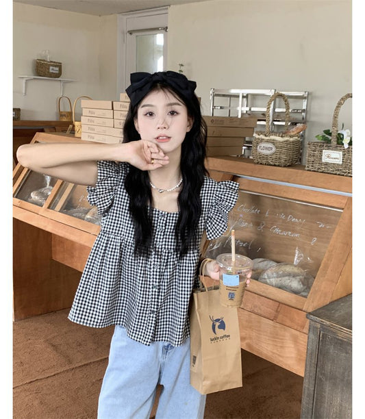 Short-Sleeve V-Neck Frill Jacquard Blouse