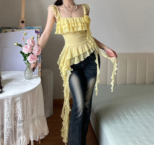 Set: Plain Ruched Crop Camisole Top + High Waist Twist Slit High-Low A-Line Skirt