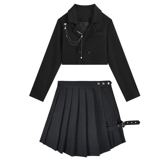 Black Gothic Chain Crop Blazer Hollow Buckle Pleated Skirt
