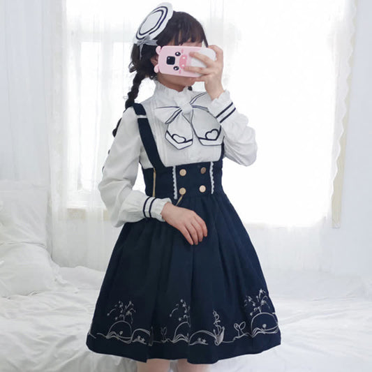 Sailor Collar Shirt Cartoon Dolphin Print Suspender Skirt