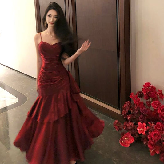 Spaghetti Strap V-Neck Plain Ruffle Panel Ruched Mermaid Evening Gown