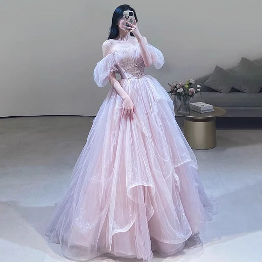 Puff-Sleeve Off-Shoulder Plain A-Line Evening Gown