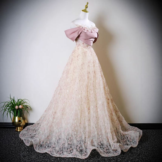 Off-Shoulder Floral Print Butterfly Accent Bow Back A-Line Evening Gown