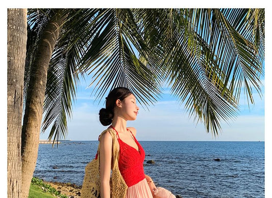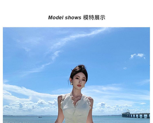 Halter V-Neck Plain Ruffle Front-Slit Maxi A-Line Dress