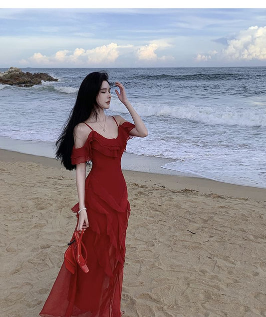 Cold-Shoulder Plain Ruffle Asymmetrical Maxi Sundress